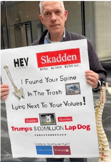 A very well respected former prosecutor for New York, David O'Keefe, decided to exercise his First Amendment right to protest the craven capitulation to Trump by one of the most "august" law firms in New York City, "Skadden" (Skadden, Arps, Slate, Meagher & Flom LLP). For his admirable story, how he was falsely arrested and the suit that he is filing for being denied his right to peacefully protest in a Private Owned Public Space ("POPS"), see the YouTube video by the Meidas Touch Network at this link: